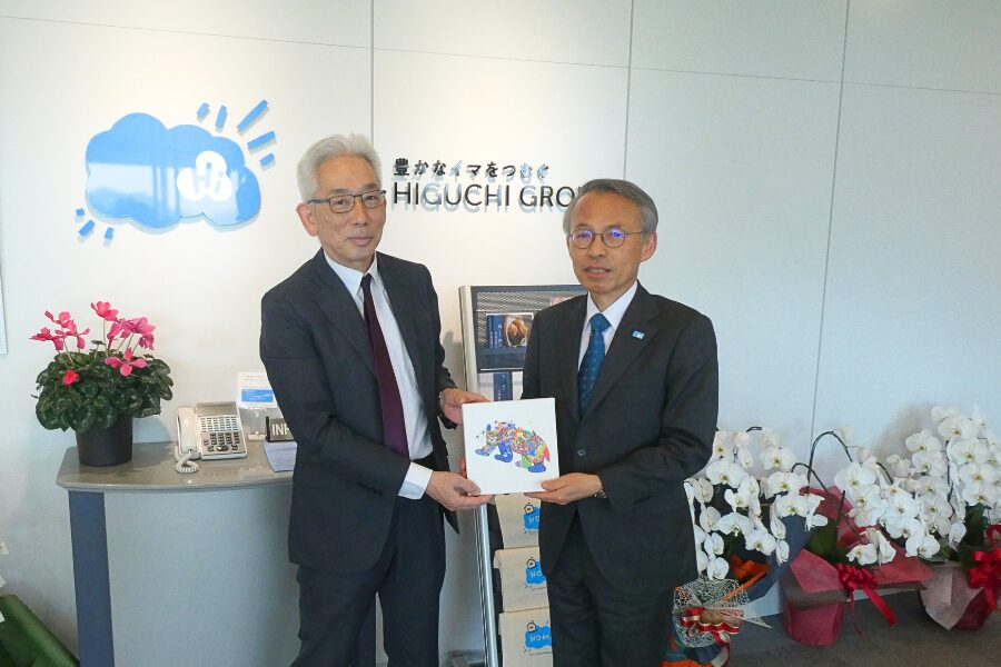 令和8年1月16日には、株式会社ひぐち様を訪問し、直接オリジナルノベルティをお渡しするとともに、これまでの温かいご支援に対し、改めてお礼をお伝えしました。